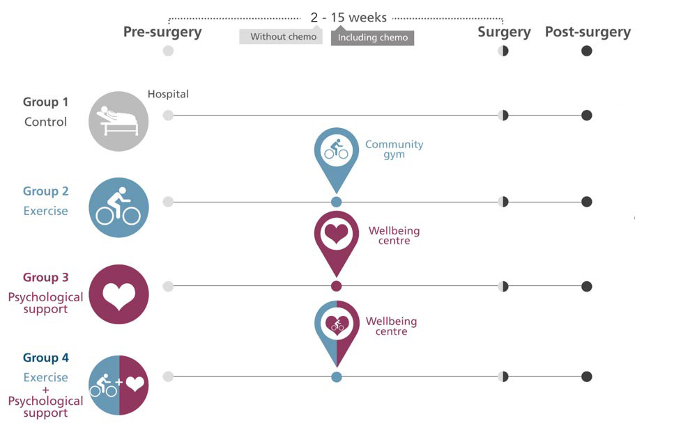 Cancer patients who are physically fit before having surgery tend to have a better recovery. Unfortunately, cancer treatments such as chemotherapy, which patients often receive before their surgery, reduce a patient’s fitness. Research at University Hospital Southampton NHS Foundation Trust has found that patients can maintain or even increase their fitness before surgery by taking part in an exercise programme in hospital. In order to find a model for delivering such a programme more widely in the NHS the team want to test if patients are also able to take part in such an exercise programme in the community (gyms and charity centres), and whether providing additional psychological support to prepare them for surgery (improving mental fitness) is also helpful to recovery.